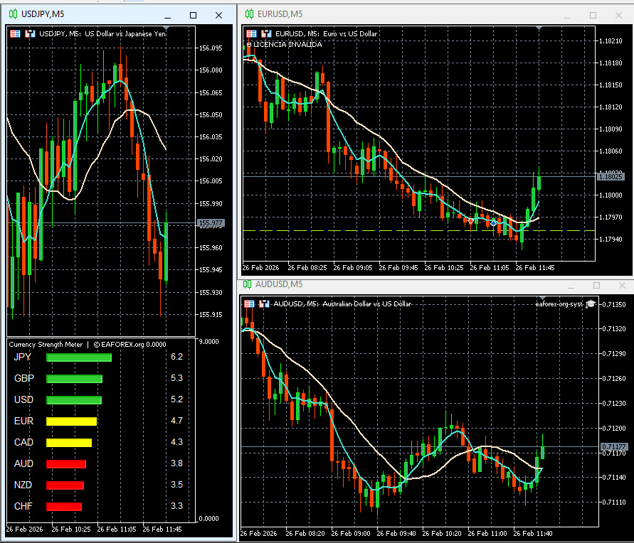 2- Si en el Top” está USD y debajo del todo está el JPY es porque el dólar ha estado subiendo . . . y EUR y AUD estarán bajando. Pero hay que estar atento al número que indica el Meter, ya que solo que el JPY aumente un poco (ej: de 2,8 a 3,1) indicará una intervención del JPY por lo que la situación se revertirá.