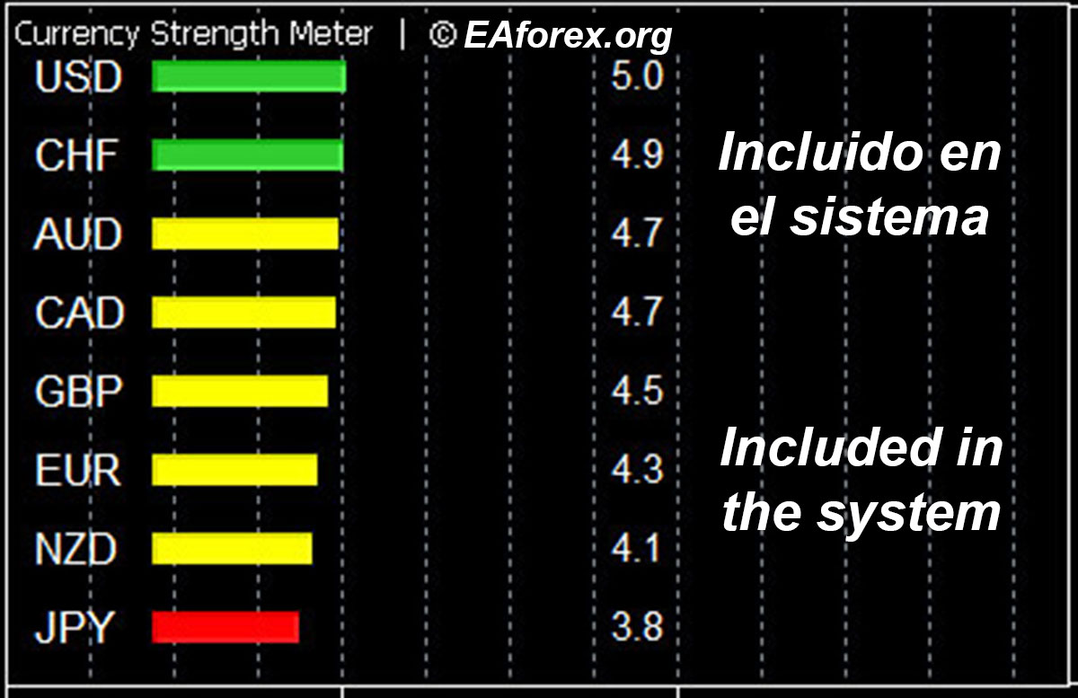2- Si en el Top” está USD y debajo del todo está el JPY es porque el dólar ha estado subiendo . . . y EUR y AUD estarán bajando. Pero hay que estar atento al número que indica el Meter, ya que solo que el JPY aumente un poco (ej: de 2,8 a 3,1) indicará una intervención del JPY por lo que la situación se revertirá.